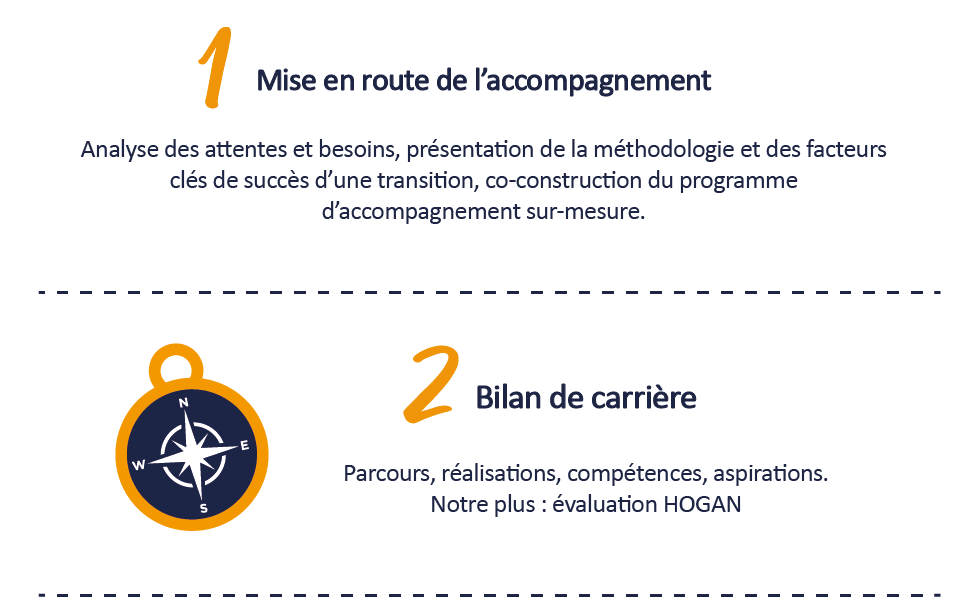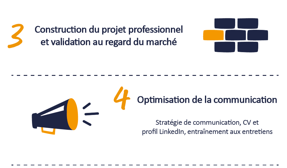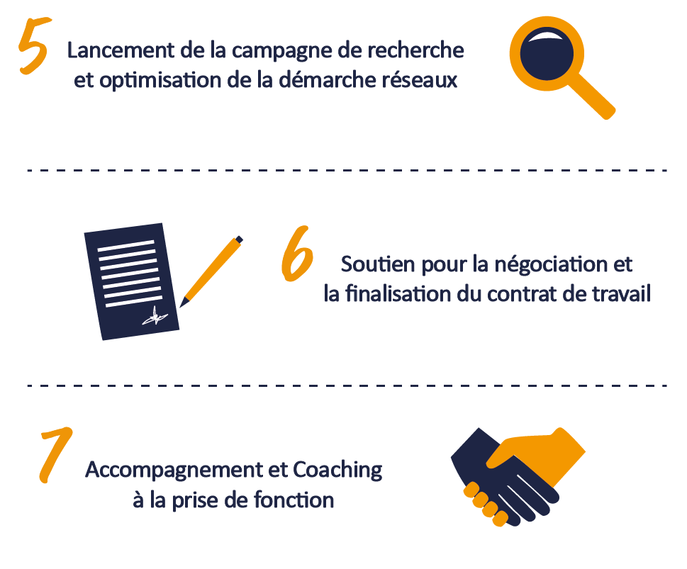 Notre méthodologie nous permet (client & coachs) d’avoir une vision globale et transverse afin de bâtir la stratégie de votre repositionnement, incluant les étapes suivantes :