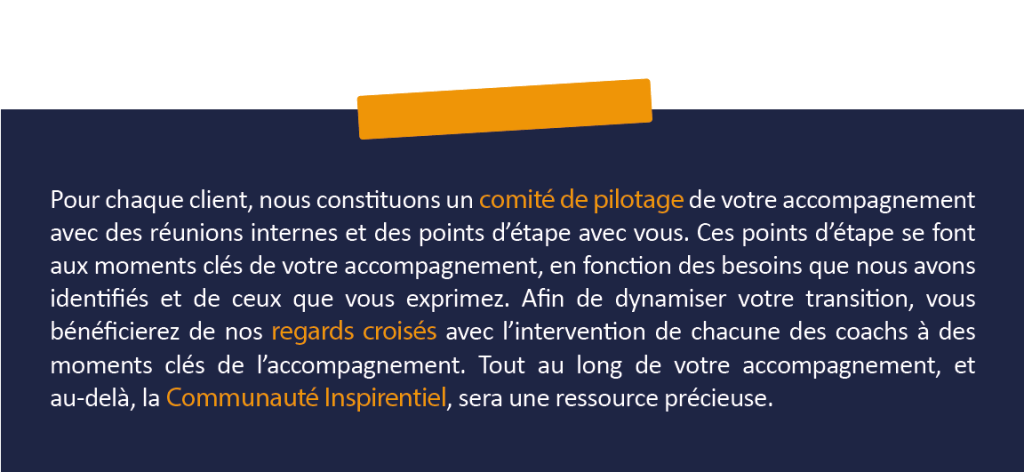 Nos atouts ? Un binôme de coachs expérimentées, engagées et à votre écoute. Un accompagnement dynamique (Regards Croisés) et sur-mesure, en fonction de vos besoins et du rythme de votre transition. La force du partage de nos réseaux, nos partenaires, nos experts (Recruteurs, Communicants, Avocats, Managers de Transition, Experts Comptables, …) et la Communauté Inspirentiel.
